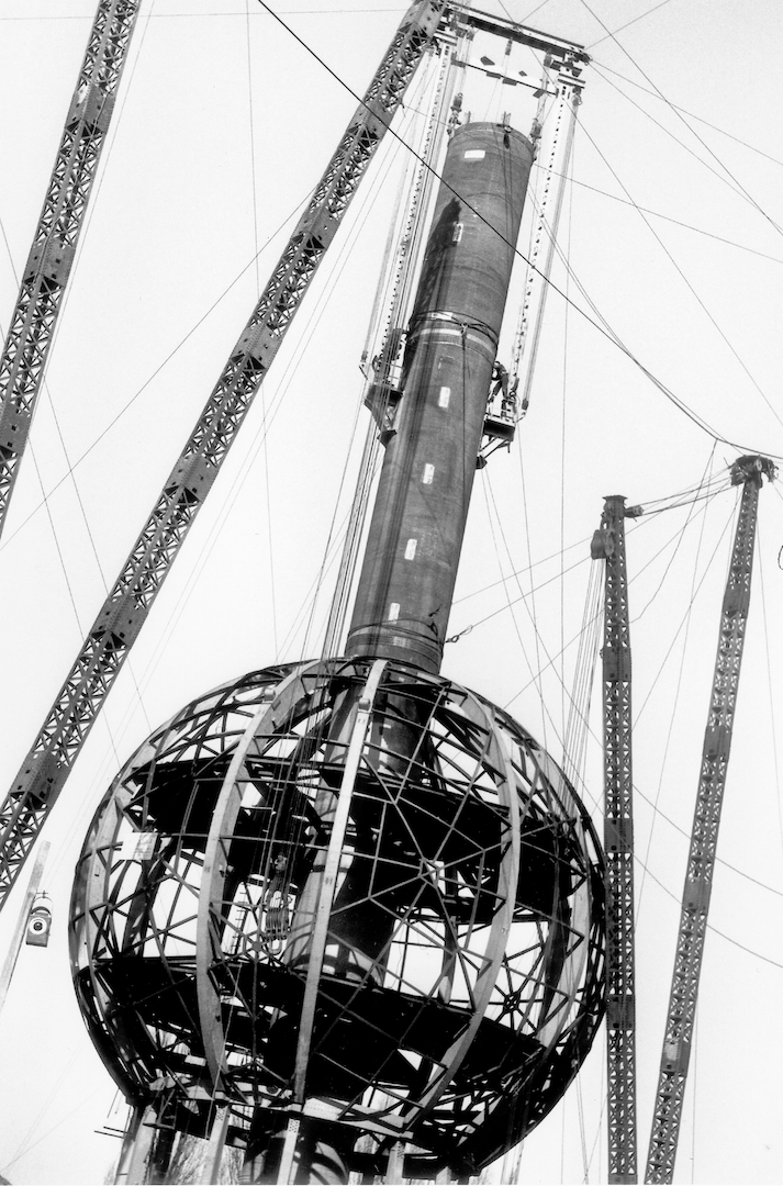 After 18 months of preparation and testing, construction began in march 1956. The various parts were erected progressively: the first vertical mast was installed in January 1957, the base sphere was put in place in May 1957, the central mast and bi-pod braces were erected between June and September 1957. The spheres were assembled progressively between October 1957 and March 1958. The Atomium was completed on 25 march 1958, just one month before the opening of the Expo.